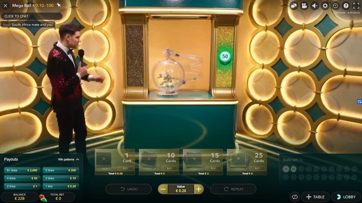 Mega Ball yra žaidžiamas su bilietu, kuriame skaičiai išsidėstę 5×5 tinklelyje su tuščiu laukeliu viduryje. Iš viso yra traukiama 12 kamuoliukų, o paskutinis su daugikliu, kurio vertė gali būti iki x100. Mega Ball išsiskiria ypač greitu tempu ir nesudėtingomis bingo taisyklėmis, kas yra puikus pasirinkimas tiek naujokams, tiek ir patyrusiems žaidėjams, kurie nori atsipalaiduoti po sudėtingesnių žaidimų. Statymus galima atlikti mažomis sumomis, kas leidžia prisiimti riziką ir pabandyti pagauti aukštą koeficientą.